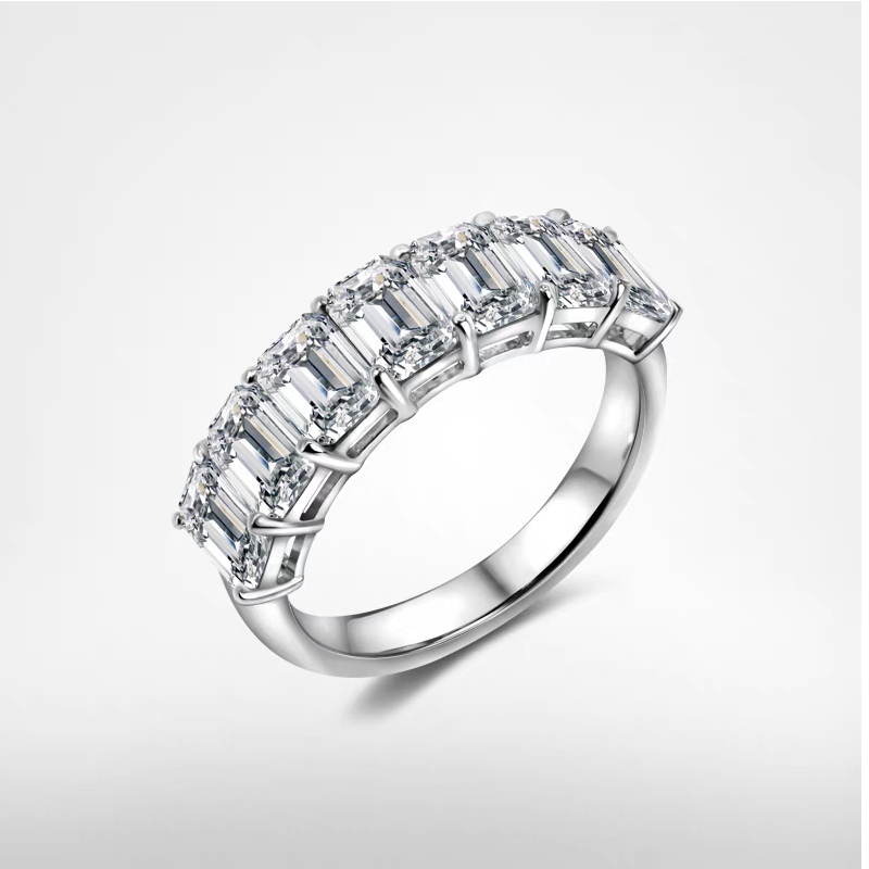 This exquisite ring showcases a stunning row of radiant, rectangular-cut stones set in a gleaming silver band. The refined prong setting highlights each stone’s brilliance, creating a sparkling effect that catches the light beautifully. Perfect for special occasions or as a statement piece, this elegant ring embodies timeless luxury and sophistication.