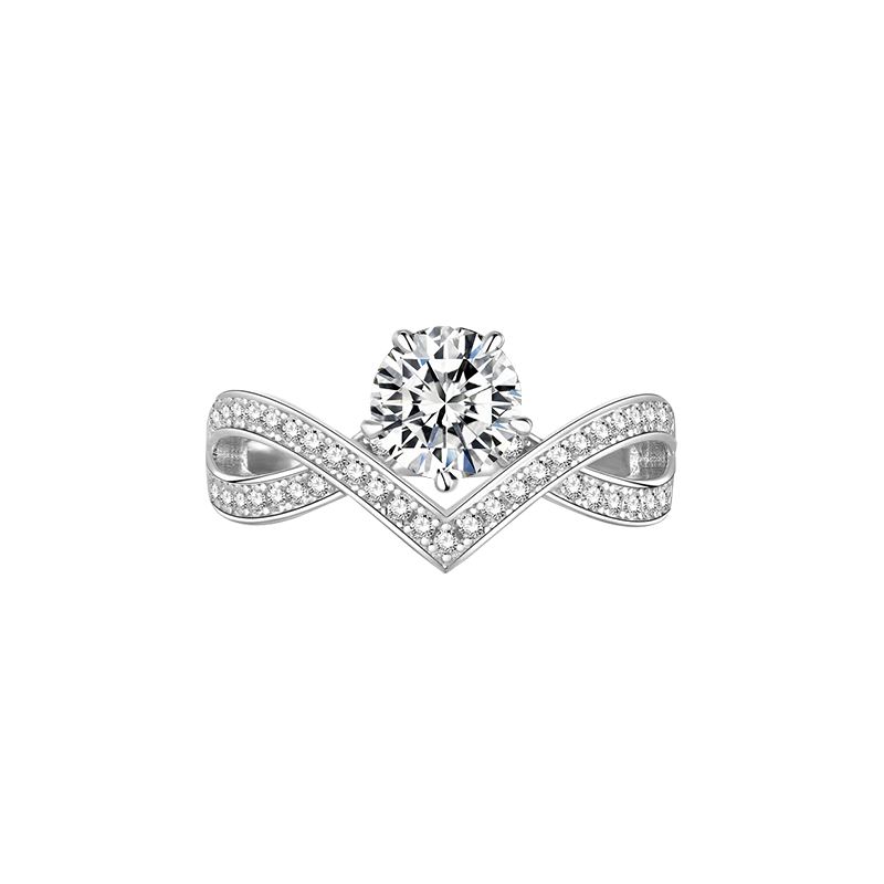 Elevate your style with this exquisite sterling silver ring featuring a stunning round-cut center stone. The elegant V-shaped band is embellished with a shimmering array of smaller stones, adding a touch of sophistication and sparkle. Perfect for special occasions or everyday elegance, this ring beautifully captures light from every angle, making it a dazzling addition to your jewelry collection. Available in various sizes to ensure the perfect fit.