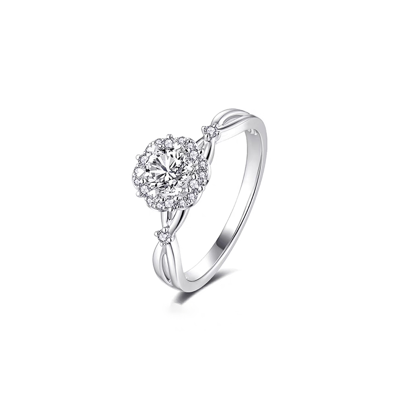 Radiate elegance with this exquisite silver ring, featuring a stunning round-cut central stone surrounded by a halo of smaller shimmering stones for added brilliance. The band intricately twists, giving it a unique and sophisticated look that captures light from every angle. Perfect for special occasions or as a cherished gift, this ring is designed to dazzle and delight. Crafted with precision and care, it offers a timeless addition to any jewelry collection.