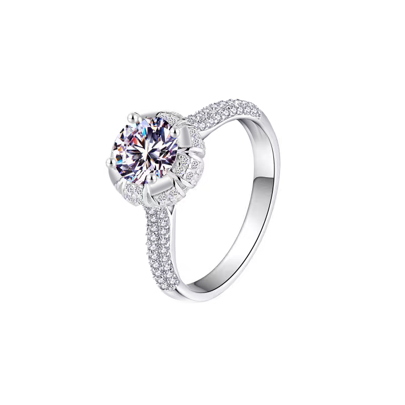Enhance your elegance with this stunning silver engagement ring, featuring a dazzling round-cut centerpiece stone that captures the light beautifully. The band is intricately adorned with pavé-set smaller stones, adding extra sparkle and sophistication. Perfect for engagements or special occasions, this exquisite piece combines timeless design with contemporary elegance, making it a must-have for every jewelry collection. Ideal for those who appreciate classic style with a modern twist, this ring is sure to impress. Available in various sizes to ensure the perfect fit.