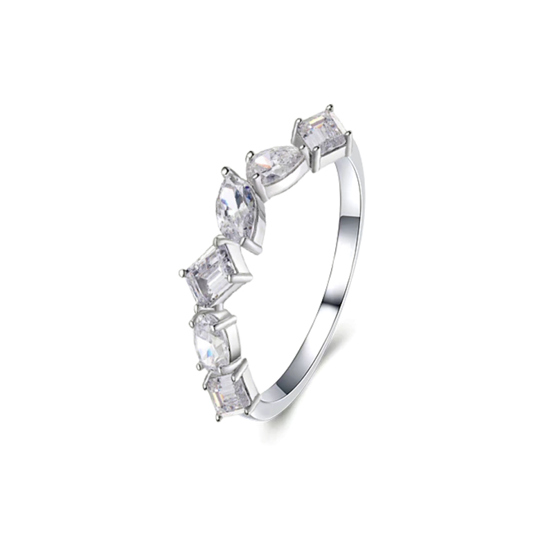Elevate your elegance with this stunning silver ring, featuring an array of multi-cut cubic zirconia stones set in a delicate band. The alternating shapes create a unique and sophisticated look, perfect for any occasion. Crafted with precision, this ring offers a modern twist on a classic design, making it a must-have addition to your jewelry collection. Ideal for stacking or wearing alone, it is sure to add a touch of sparkle to your ensemble. Available in various sizes to ensure a perfect fit.