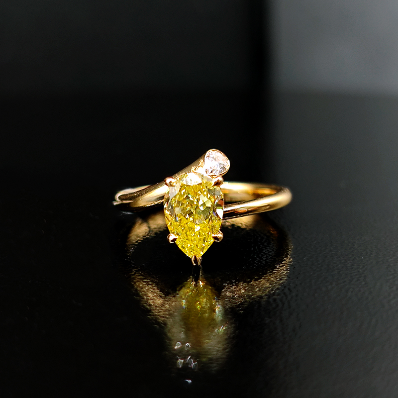 Elevate your elegance with this exquisite pear-shaped yellow diamond ring. The vibrant yellow diamond is expertly set in a luxurious gold band, accompanied by a sparkling round white diamond for added brilliance. This stunning piece offers a unique blend of sophistication and modern charm, making it the perfect addition to any jewelry collection or a memorable gift for a loved one. Ideal for special occasions or everyday wear, it promises to turn heads and capture hearts.